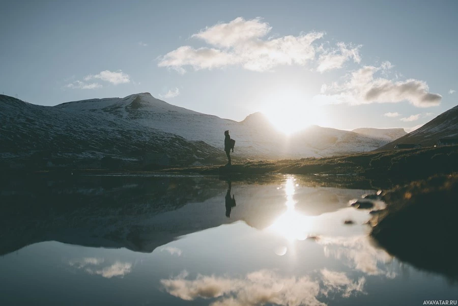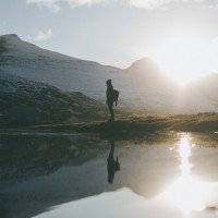 a body of water. A silhouette of what appears to be a person is visible on the far side of the lake, adding a human element to the scene. In the background, there are mountains that appear to be covered in snow, suggesting this might be a colder climate or