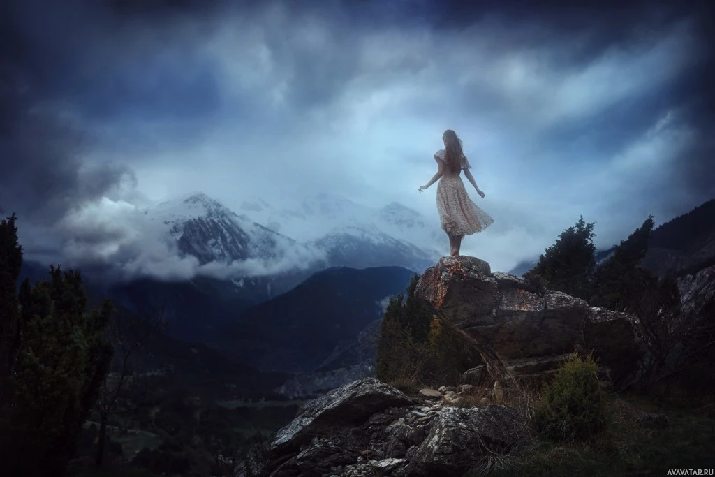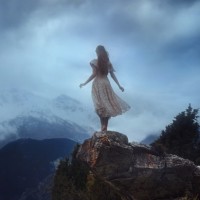 a young woman standing on what appears to be a mountain peak. She is facing away from the viewer, looking out towards the horizon with her arms spread as if embracing nature or perhaps feeling the wind against her dress. The attire of the girl suggests it might be