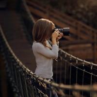 На снимке изображена молодая девушка, держащая камеру, стоящая на том, что кажется подвесным мостом. Она смотрит на воду или на закат, предполагая, что она может фотографировать пейзажи вокруг нее. Место кажется спокойным и живописным, с естественным освещением, которое добавляет безмятежной атмосфере сцены.