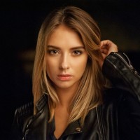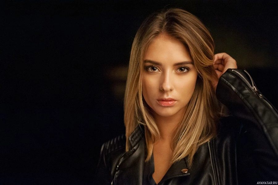 На снимке изображена молодая женщина со светло-коричневыми волосами. Она носит темную куртку и, кажется, находится в помещении с тусклым освещением, что придает изображению несколько угрюмую атмосферу.