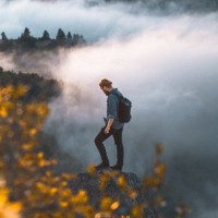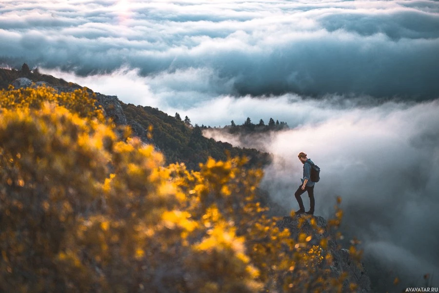 yellow flowers visible near the person's feet, which might indicate that this scene is taking place during fall or autumn when such plants are blooming. The backdrop suggests a mountainous landscape with dense forestation, contributing to a sense of tranquility and