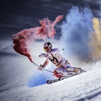 covered slope. There is smoke or powder being emitted behind the skier, which suggests that they might be using