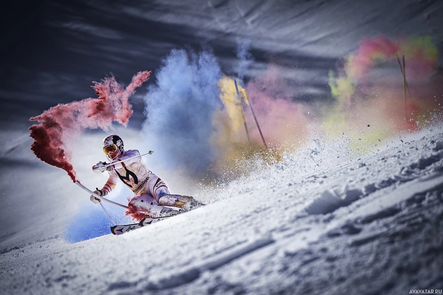 specialized equipment to create this effect for photography purposes. The skier is wearing typical ski attire and appears to be in motion, as indicated by the blurred background and