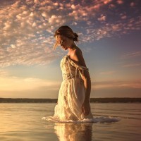 shallow water at sunset. The individual appears to be female and is wearing a light,