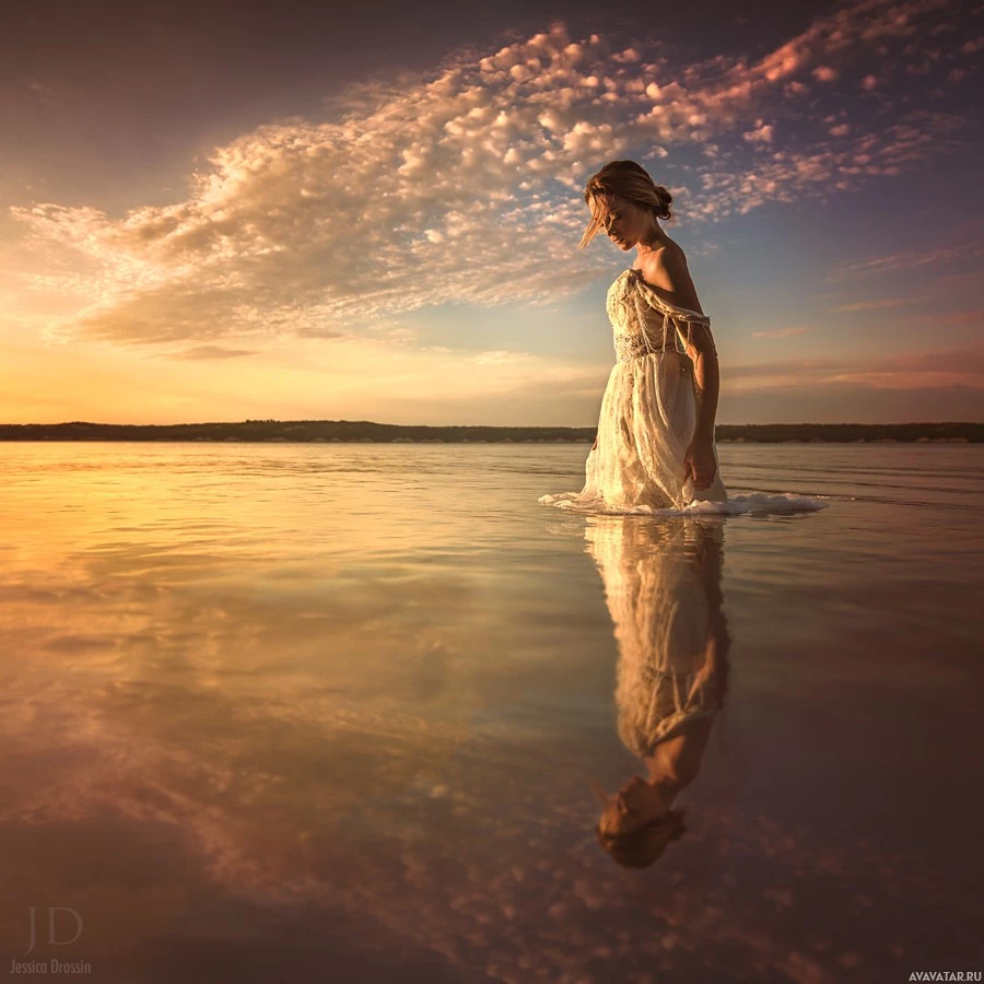 flowing garment that suggests it could be a dress or gown. The reflection of the woman on the water's surface creates a beautiful symmetry with her actual form, enhancing