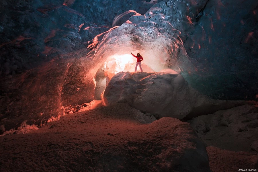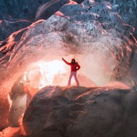 a red jacket and seems to be posing for the photo, with their hands raised as if embracing the experience or the cold environment of the cave. The cave has bright orange or red lighting that contrasts with the cool