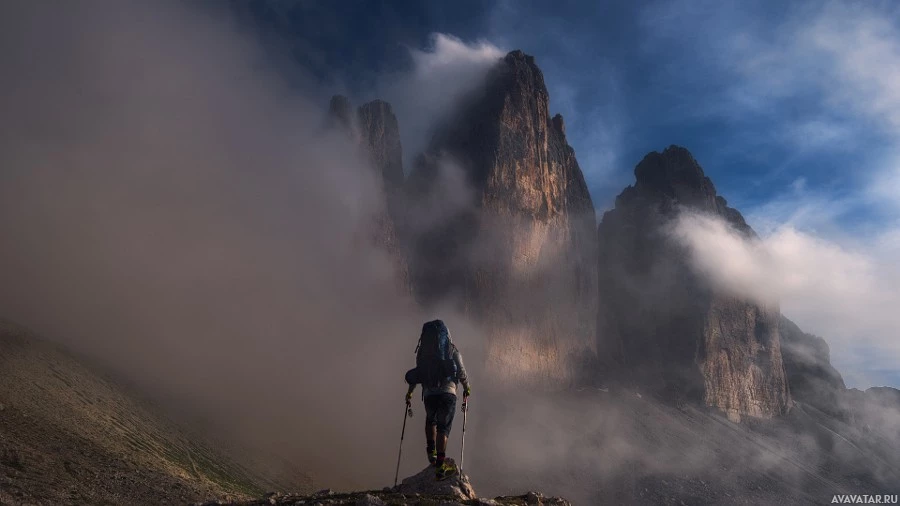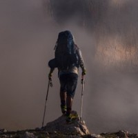 The image shows a person, presumably a mountaineer or hiker, at