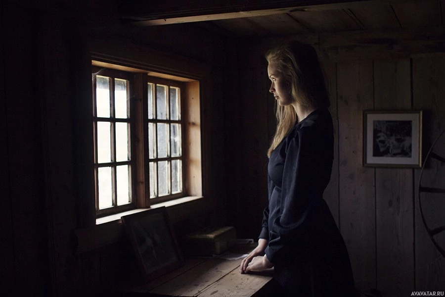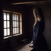 a wooden cabin. She is looking out through an open window with white-framed panes, suggesting it might be dusk or dawn given