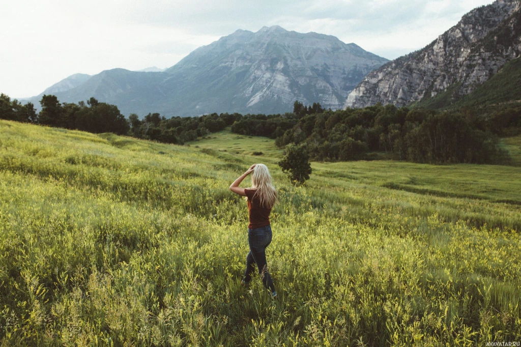 sleeved top with dark bottoms. They are facing away from the camera and seem to be looking at something out of frame, possibly observing the landscape or nature around them. In the background, there are mountains that suggest this could be a rural or natural setting. The person seems to be enjoying the environment.