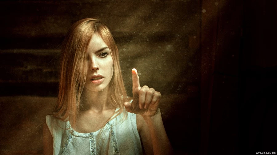 an indoor setting, possibly a room with some natural light filtering through, creating a soft glow around her. She is making a gesture with her right hand that might suggest a command or instruction of some kind. Her expression is intense and focused, which could indicate concentration on