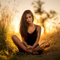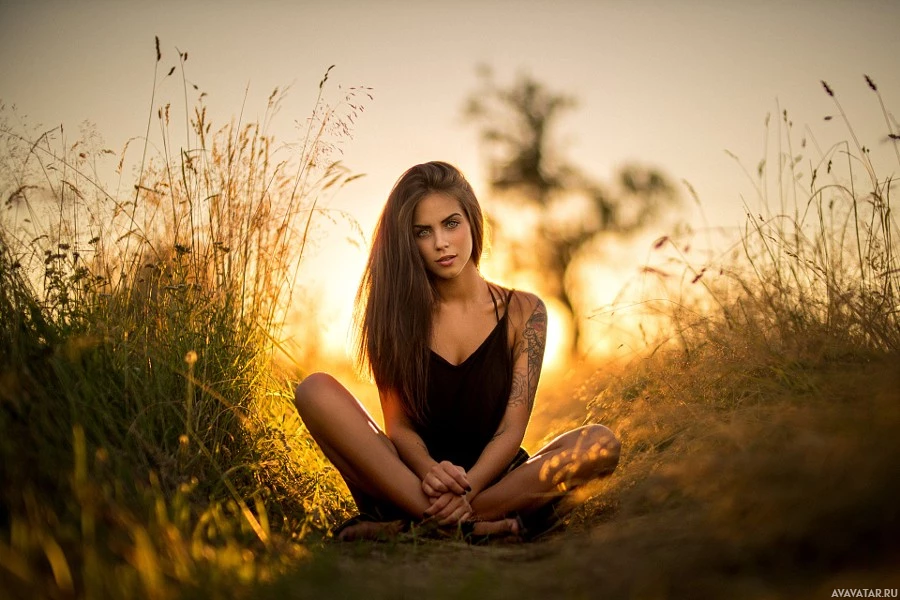 The image shows a woman sitting on the grass with her legs crossed, appearing to be in a contemplative or relaxed pose. She is bathed in sunlight, suggesting it might be either dawn or dusk given