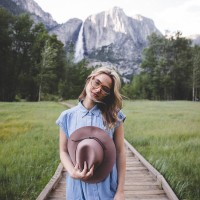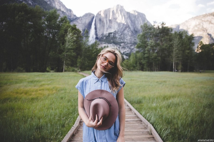 casual clothing that includes a denim shirt and what appears to be a wide-brimmed hat. The setting looks like a natural
