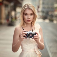 a young woman with blonde hair, who appears to be posing for a photograph. She is holding a camera, which she seems to be using to take her own picture, and her gaze is directed towards the viewer. She's wearing