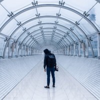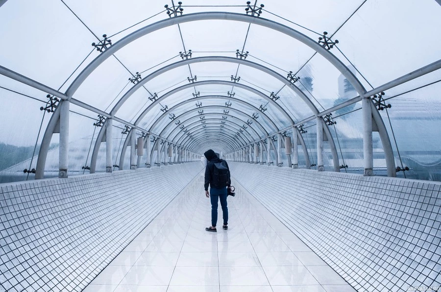 На этой фотографии я вижу человека, идущего к камере вдоль того, что кажется архитектурным сооружением или коридором с изогнутой крышей. Настройка, возможно, является художественной инсталляцией или частью современного здания. На картинке нет других людей, и трудно различить дополнительные детали из-за ограниченной предоставленной информации.