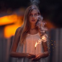 the soft lighting. She appears to be looking away from the camera, with her face turned slightly to one side. She has