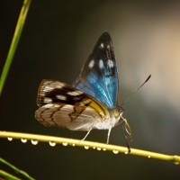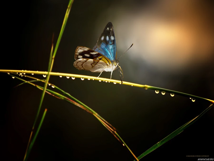 droplets of water visible on the grass, indicating that it may have rained recently or is currently drizzling. The background appears to be