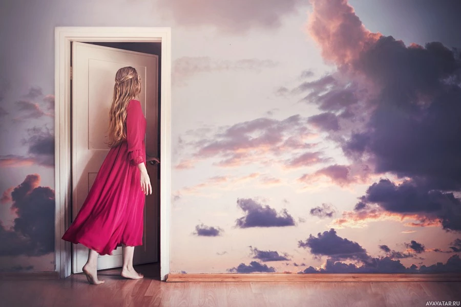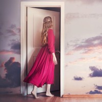 a pink dress, standing in an open doorway. She appears to be looking at something or someone out of the frame, with her back turned towards the viewer. Her pose and expression suggest she might be surprised or intrigued by what she's seeing. The background features