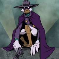 the animated movie "Darkwing Duck." This character is anthropomorphic, with human characteristics and dressed in a costume that includes