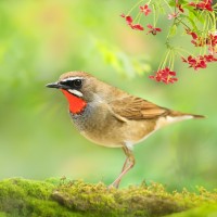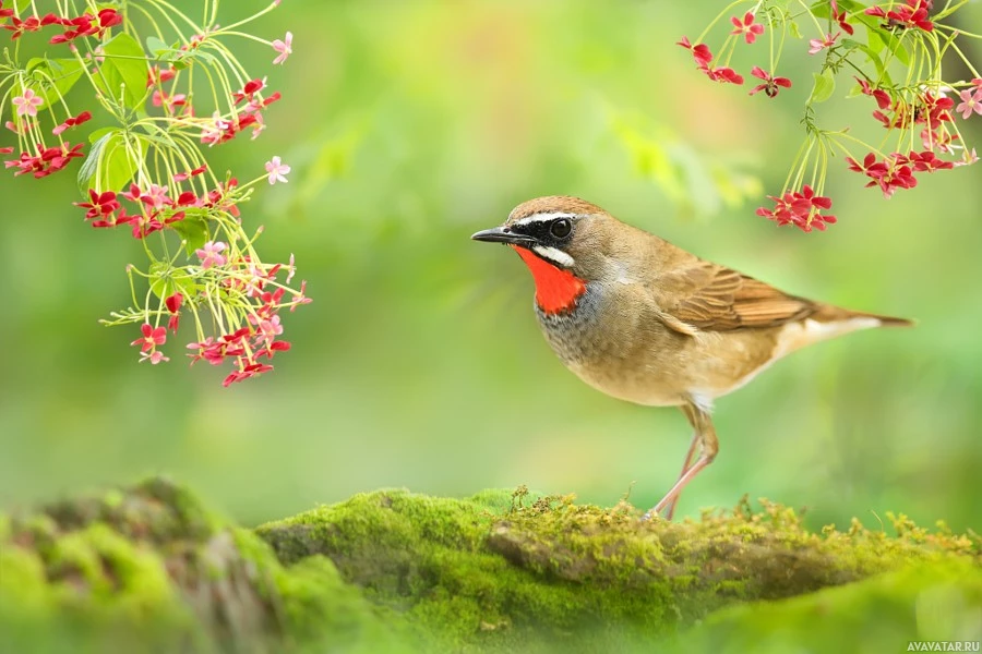 distinctive markings, including a red patch on its head and wings. In the background, there are blossoming trees or shrubs with
