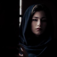 The image shows a woman wearing a hijab and looking out of a window. Her expression is contemplative, and she appears to be in