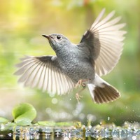 a small bird in flight. It appears to be a young grayish or blue-gray bird, possibly a juvenile, with its wings spread wide as it soars over
