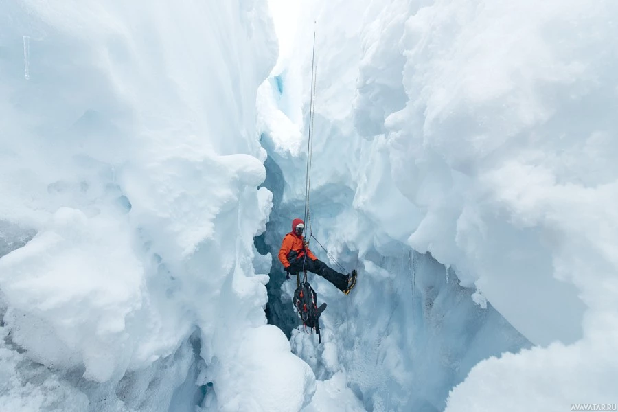 ice axes to secure their footing on the frozen wall of the crevasse. The environment suggests a cold, high-