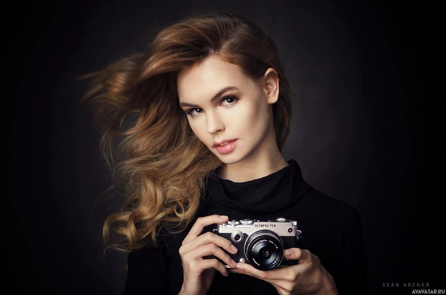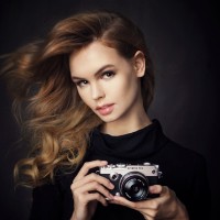 long hair and is wearing makeup that accentuates her facial features. She seems to be engaged in the act of capturing a moment with her camera, which is likely a digital SLR given its design and lens configuration.