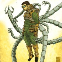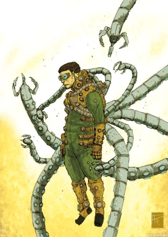 mechanical extensions. This character has multiple tentacle-like arms that extend from the shoulders and are interconnected with mechanical components, suggesting