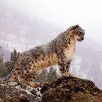 rocky terrain during what appears to be a snowy or misty day. The snow leopard is looking directly at the camera with