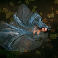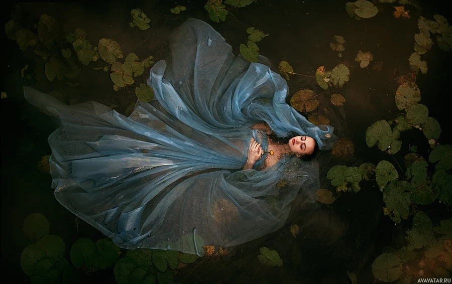 an elegant dress that is cascading into the water. Her pose suggests she might be at ease or possibly immersed in thought as she lies amongst the plants. The setting looks tranquil and somewhat mystical due to the lighting and the reflection of her on the water's surface.