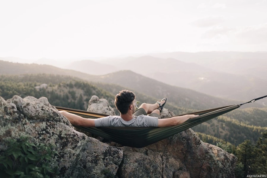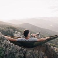 The image shows a person, likely a man, sitting in a hammock that is suspended between two points. He appears to be relaxing or enjoying the view from a high