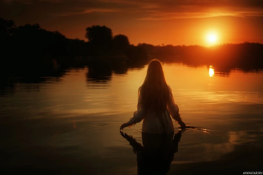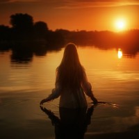 long hair and is facing away from the viewer, looking out towards the horizon where the sun is partially visible below the horizon line. The scene is serene and could suggest reflection or contemplation.
