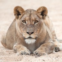 На картинке изображен лев, лежащий на боку с расслабленной осанкой. Похоже, что он отдыхает в песчаной или пустынной среде. Взгляд льва направлен на камеру, придавая ей несколько удивленное или осторожное выражение.