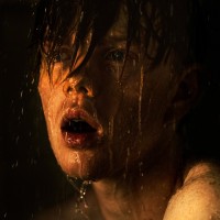 The image shows a person with their eyes closed and an expression of shock or surprise. Water droplets can be seen on the face, suggesting that they might have been in water or it was splashed onto them. There's no indication of age or gender, but the appearance could suggest youth. The context or setting is not clear from the image alone.