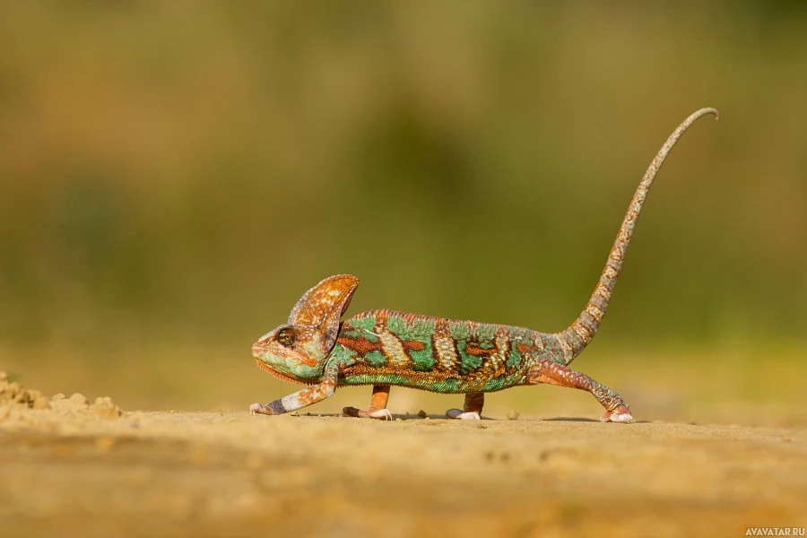 The image shows a chameleon walking on what appears to be sandy or