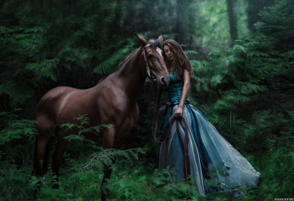 an elegant dress with long sleeves and a flowing skirt. She is wearing heels and has her hair styled elegantly. In front of her, there's a majestic brown horse with a shiny coat and black mane, standing calmly on