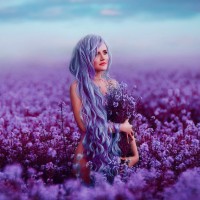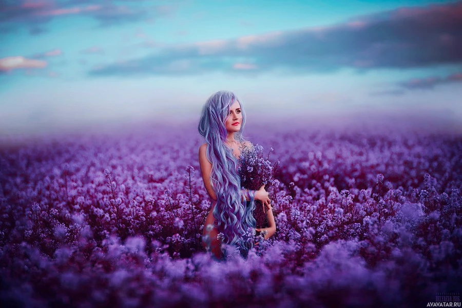 На картинке изображен человек с фиолетовыми волосами, который кажется молодой женщиной. Она подняла руки и, кажется, стоит среди поля ярких фиолетовых цветов. Небо на заднем плане предполагает, что это может быть либо рассвет, либо сумерки из-за мягкого освещения. Общая атмосфера изображения безмятежна и несколько эфирна, с акцентом на красоту природы.