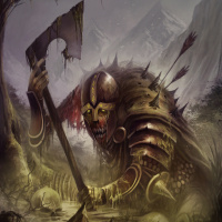 a fantastical scene featuring a figure that resembles a zombie or undead warrior. This creature is holding what appears to be an ancient weapon, possibly a mace or club with spikes on it, and seems to be emerging from the ground or a cave, as suggested by the dark,