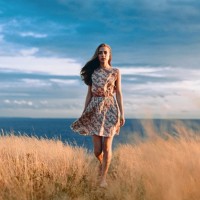 a body of water, possibly the ocean. She appears to be looking out over the water with a contemplative or introspective expression. Her dress suggests it might be a cooler day or a location where such attire is common. The sky has some clouds and is blue with light shining through, suggesting either