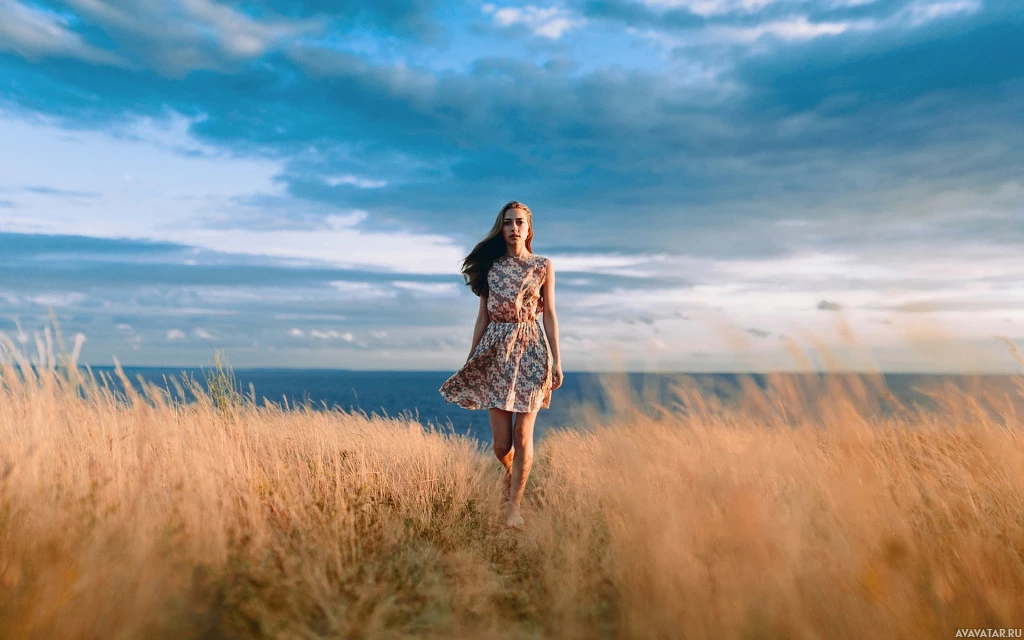 The image shows a woman standing on the edge of a field that leads towards