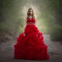 The image shows a young woman wearing an elaborate red dress with ruffles or flounce, standing in what appears to be a natural setting with trees and sunlight filtering through. She is looking off into the distance with a contemplative expression on her face. It's a photographic portrait that captures the elegance of the dress against a serene backdrop.
