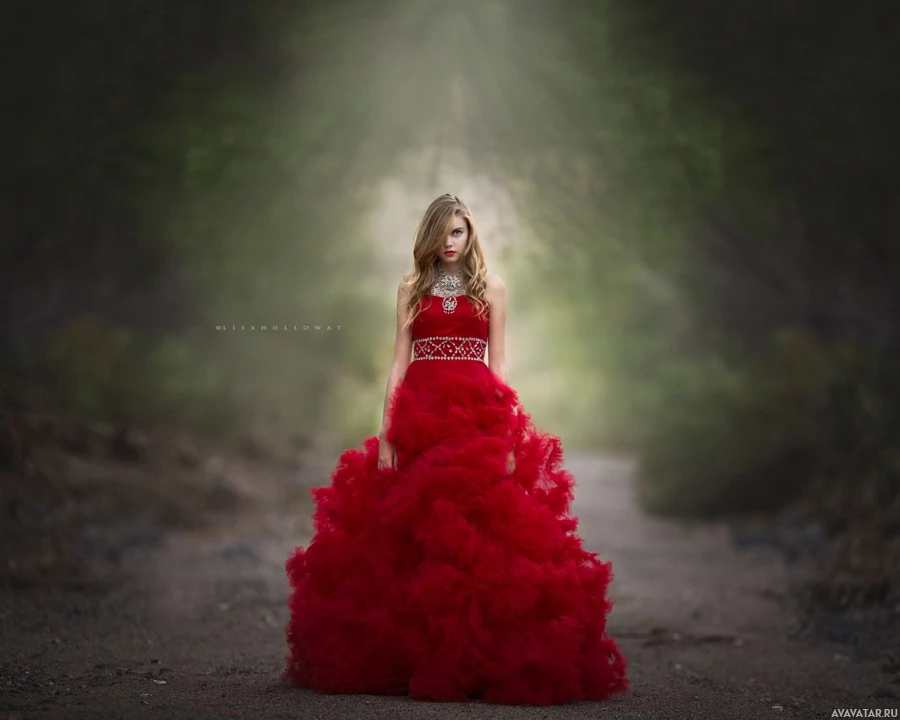 На снимке изображена молодая женщина, одетая в сложное красное платье с рычажками или взмыванием, стоящая в естественной обстановке с деревьями и солнечным светом. Она смотрит вдаль с созерцательным выражением на лице. Это фотографический портрет, который отражает элегантность платья на безмятежном фоне.