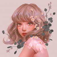 pink flowers scattered around her head, adding a touch of nature to the artwork. She wears a light-colored outfit with what appears to be