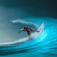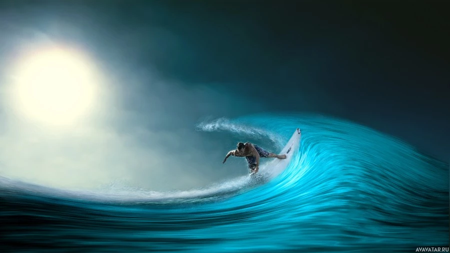 a dynamic scene that captures the essence of surfing, with the ocean and sky forming a dramatic backdrop to the action.