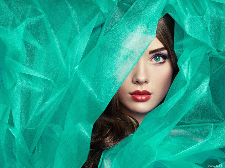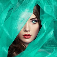 long hair and is wearing what appears to be tulle fabric or paper in various hues of teal around her face, creating a unique and striking effect that partially obscures her features. The overall style of the image suggests it could be related to fashion, art, or an editorial piece designed to evoke