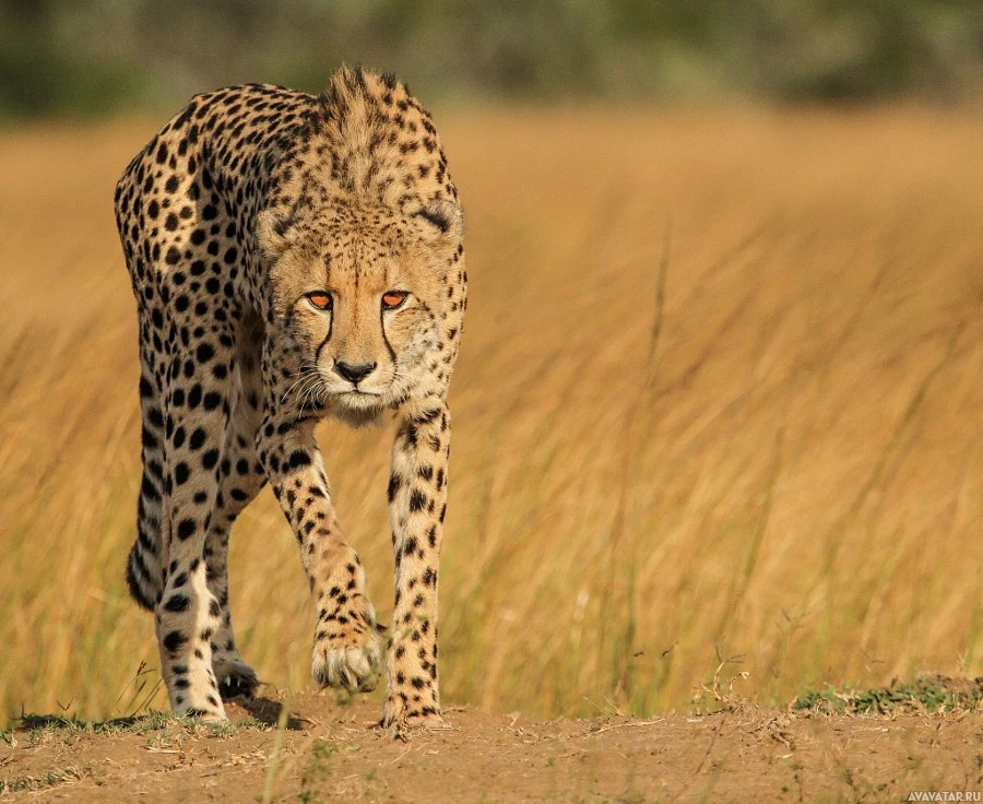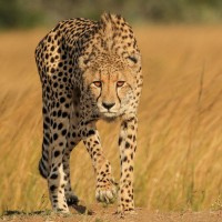 На картинке изображен гепард, проходящий через то, что кажется сухим лугом. Гепард смотрит на камеру с выражением тревоги, предполагая, что он мог заметить что-то интересное или тревожное. Этот тип среды обитания согласуется с природной средой, где гепарды встречаются в дикой природе.