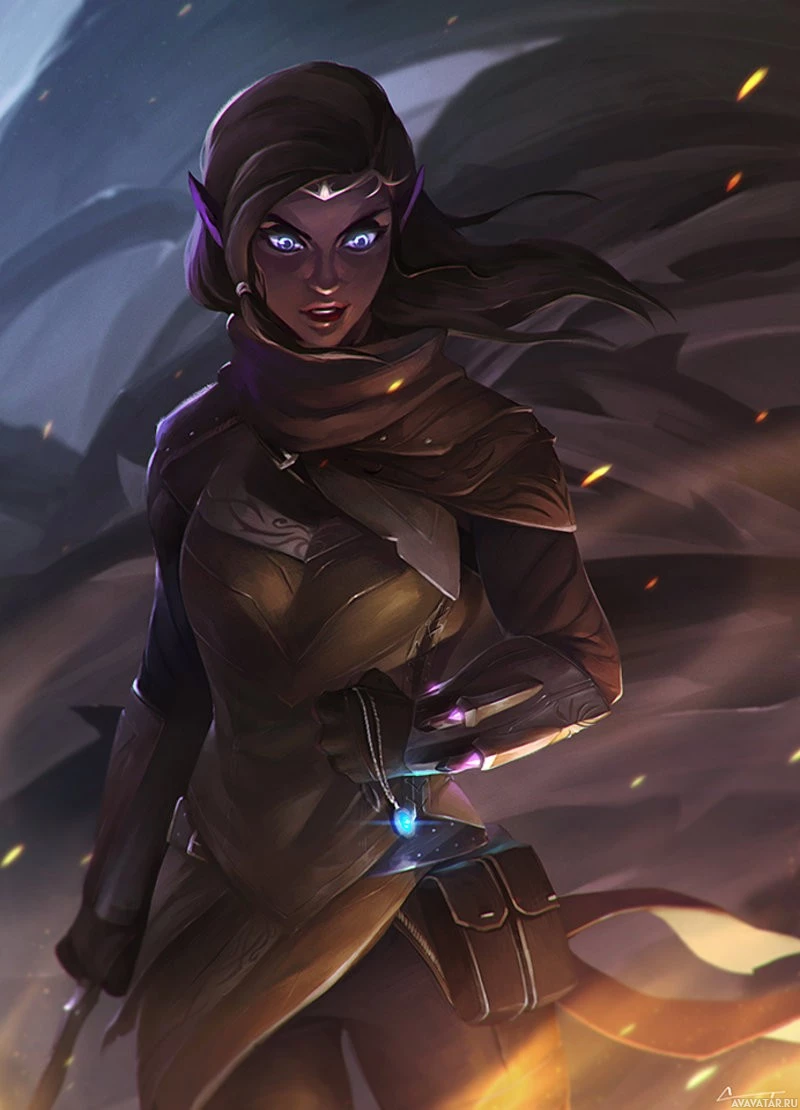 the fantasy game "D&D" (short for Dungeons & Dragons). She is depicted as an elf, with pointed ears and what appears to be magical or mystical features such as