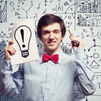 a young man with a bright smile, holding up a sign with a light bulb symbol on it. He is surrounded by various scientific or mathematical diagrams and equations, suggesting a theme of innovation, ideas, or intelligence. His attire appears to be casual yet smart.