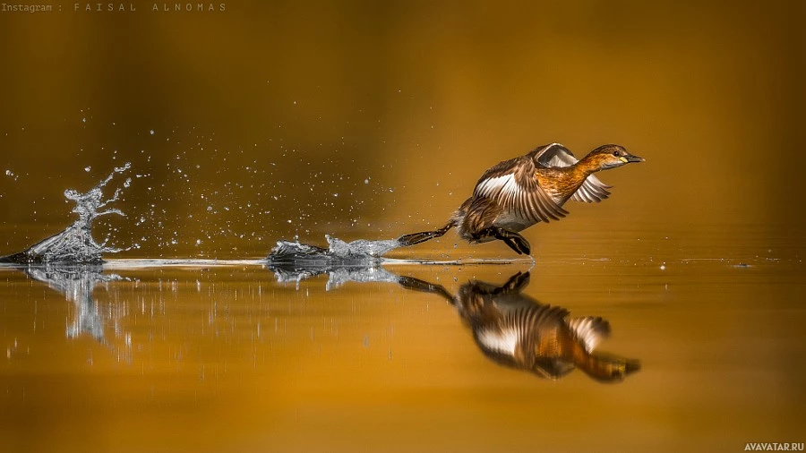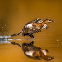 a splash effect visible to the left of the duck, indicating movement and adding dynamism to the scene. The background suggests it might be taken in
