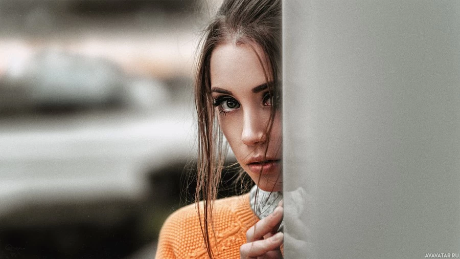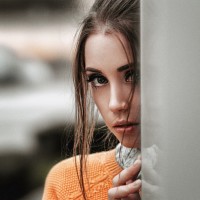 an orange sweater and has her lips slightly parted as if she is in mid-speech or about to speak. The image has a grainy texture and a vintage filter applied to it, giving it